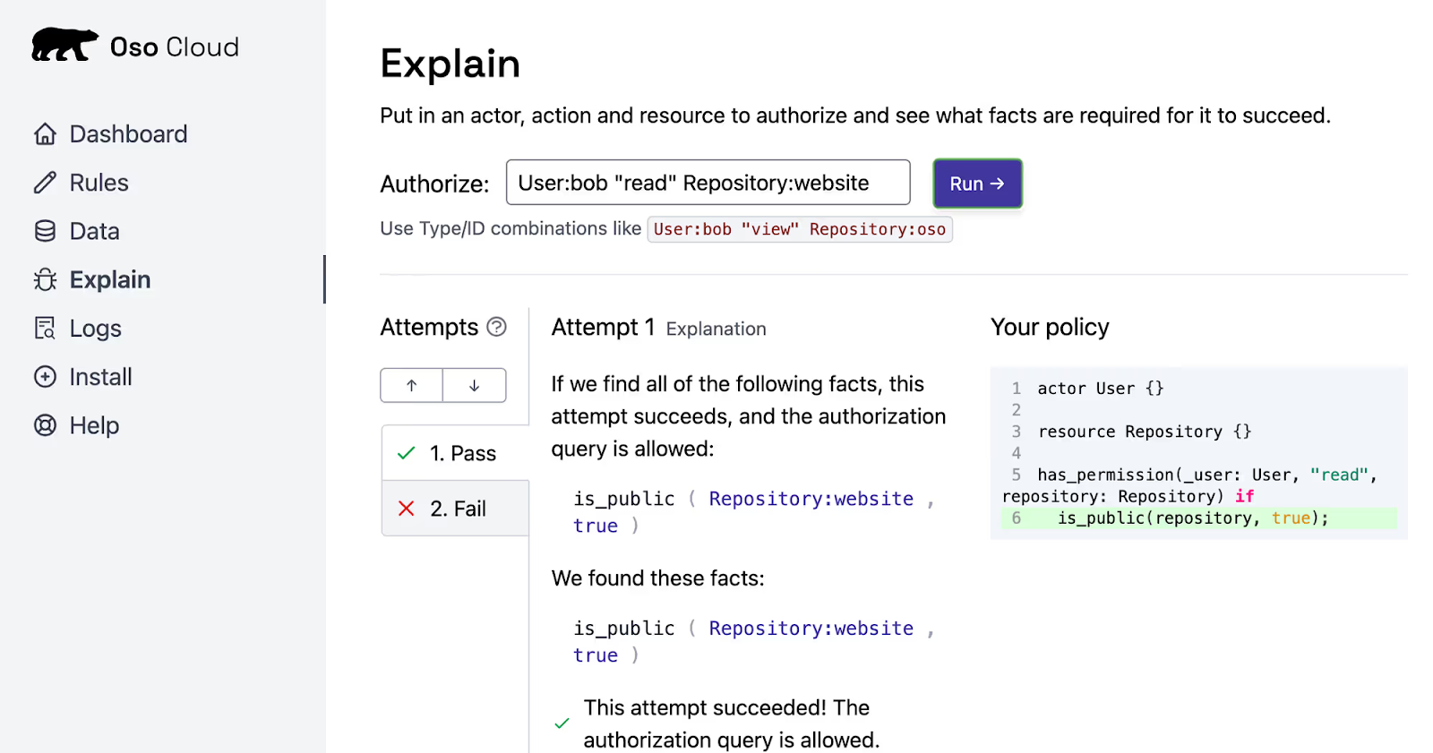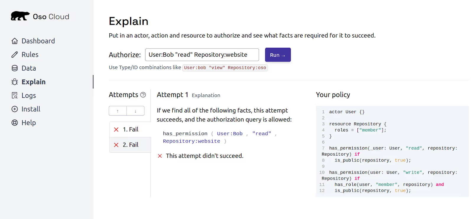 Navigate to Oso Cloud's "Explain" tab, which lets you simulate authorization queries. In Explain, run: