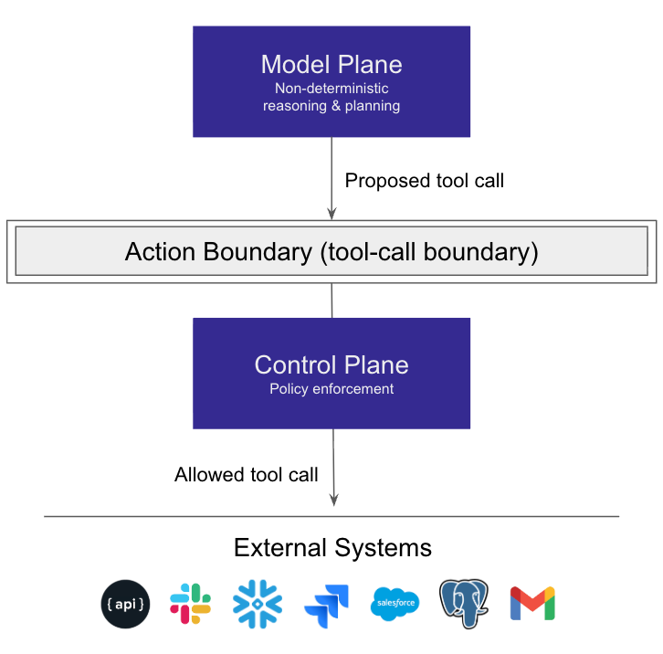 Deterministic enforcement at the action boundary: The system must enforce policy at the tool-call boundary in a way the model cannot override with language.